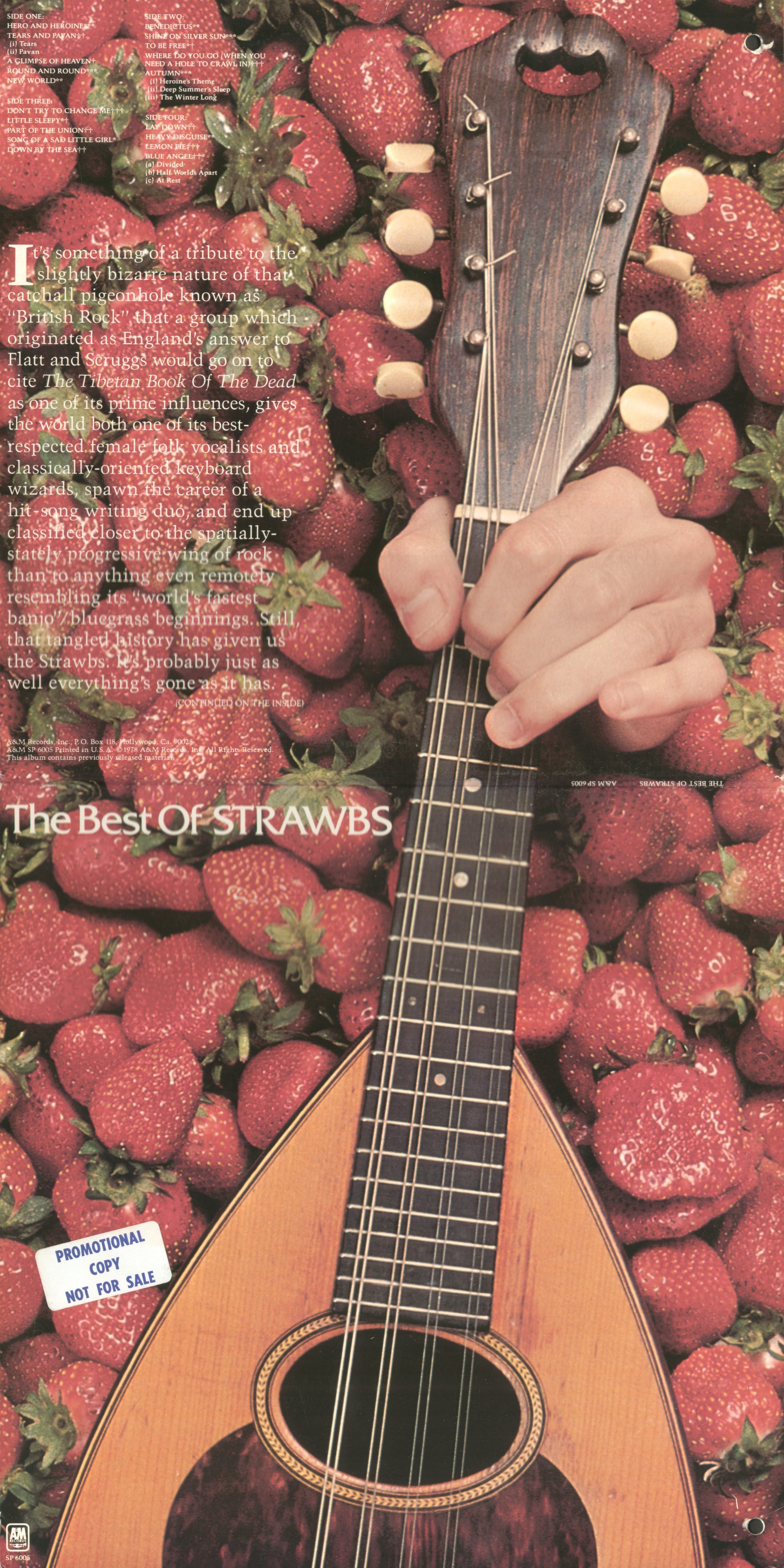 Vinyl album (US): SP 6005 (A&M, 1978, 2LP) . Gatefold sleeve, as UK version, with US addresses, US catalogue numbers inside. The liner notes on the back cover are in white against a darker than usual reproduction of the strawberry background and much easier to read than the UK and especially the Dutch version. Two different types of promo sticker. US inner spread (see note above.)