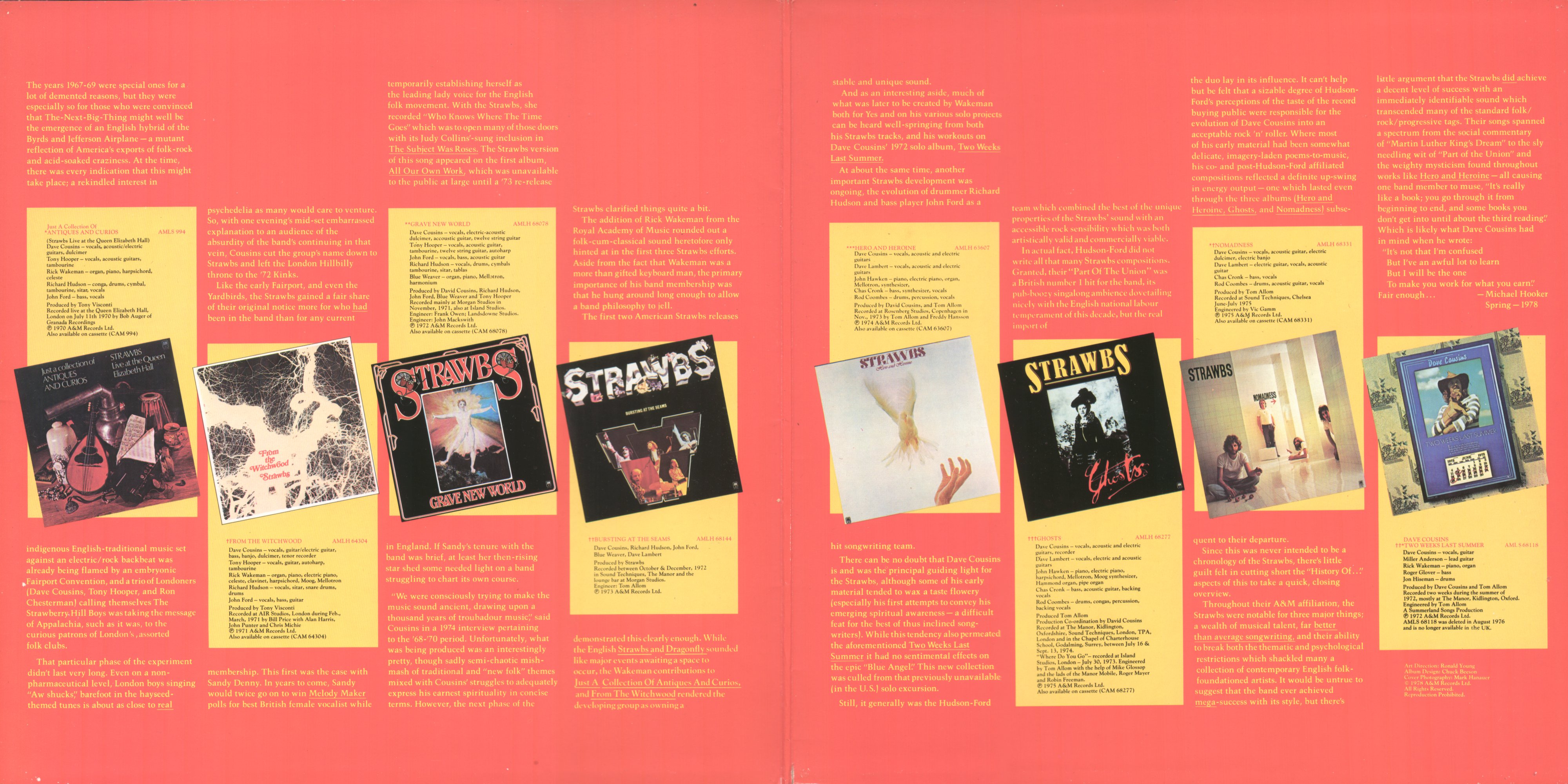 Vinyl album (UK): AMLM 66005 (A&M, 1978, 2LP). Gatefold sleeve, outside features hand reaching from under a covering of strawberries to grasp the neck of a mandolin (though such an instrument featured on the Antiques And Curios cover, a mandolin rarely appeared on a Strawbs recording ... go figure!). Title lettering and sleeve notes on back are in yellow. UK inner spread (see above).