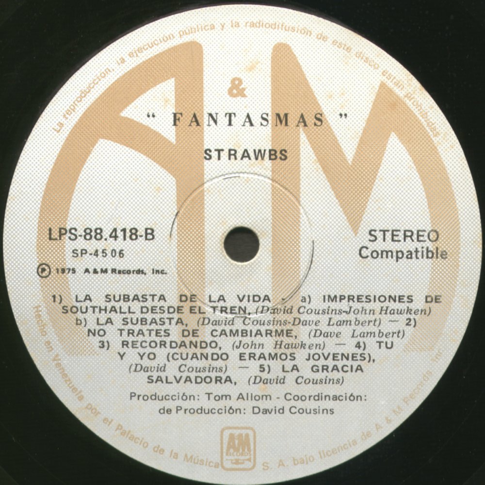 Vinyl album: LPS 88418 (A&M/El Palacio de la Musica, Venezuela, 1975) Pretty identical to the US version, I'd imagine, with the US PO Box addres on the back sleeve. Also on the back sleeve, the Venezuelan company logo "Hecho en Venezuela por ..." , the cat number and a "D" in a circle ("distributed"?). No insert, a scrunched polythene inner.