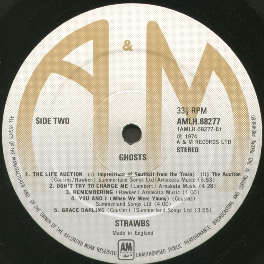 Vinyl album: AMLH 68277 (A&M, UK, 1974). Single sleeve, with cream coloured inner sleeve setting out lyrics over faintly watermarked version of the melting strawberry which was first used (as far as I know) in the 1973 A&M brochure, from where it was painted on to the back of my schoolbag and eventually became incorporated into the Strawbsweb logoberry. There's another one reversed out in white at the bottom right of the back cover. Silver labels.