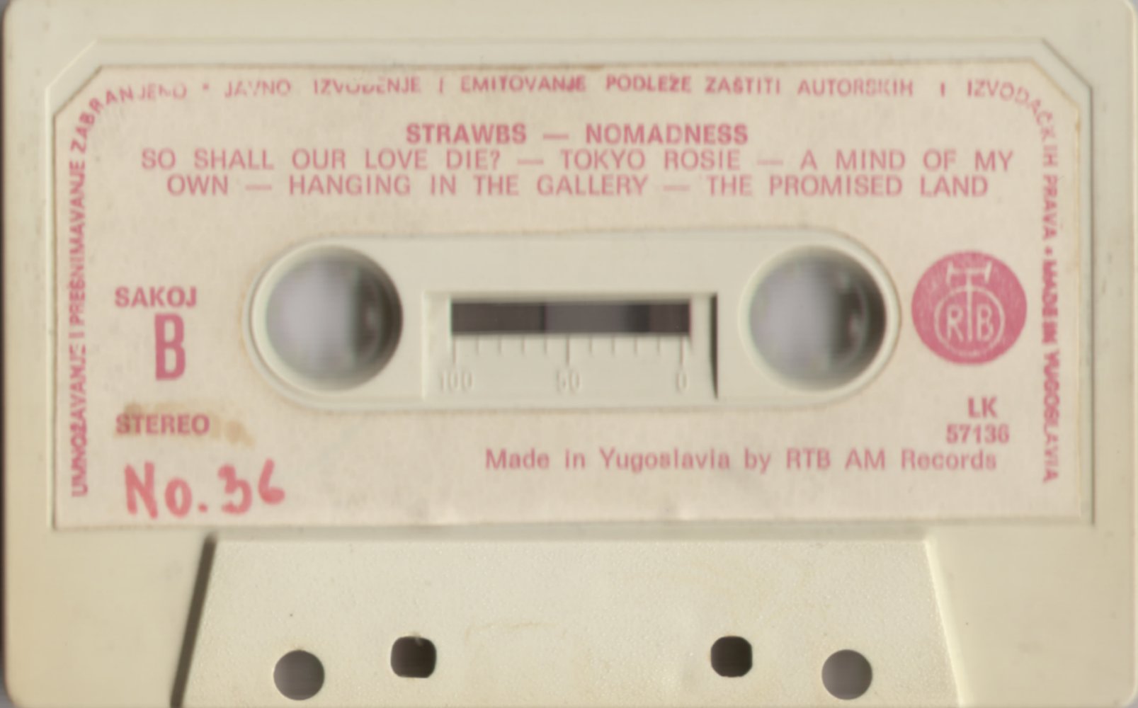 cassette: LK 57136 (RTB, 1975?). This Yugoslavian cassette release follows the track litsing of the UK LP. The copy I have has been lovingly pre-owned by "Leon", who has signed and typed on the inner spine "Leon - September 1977", and typed the number "35" on the outer spine and front. He has also written "36" and "Leon" on the cassette itself, and in careful black felt tip on the top edge of the cassette "HANDLE CAREFULLY". I will.
