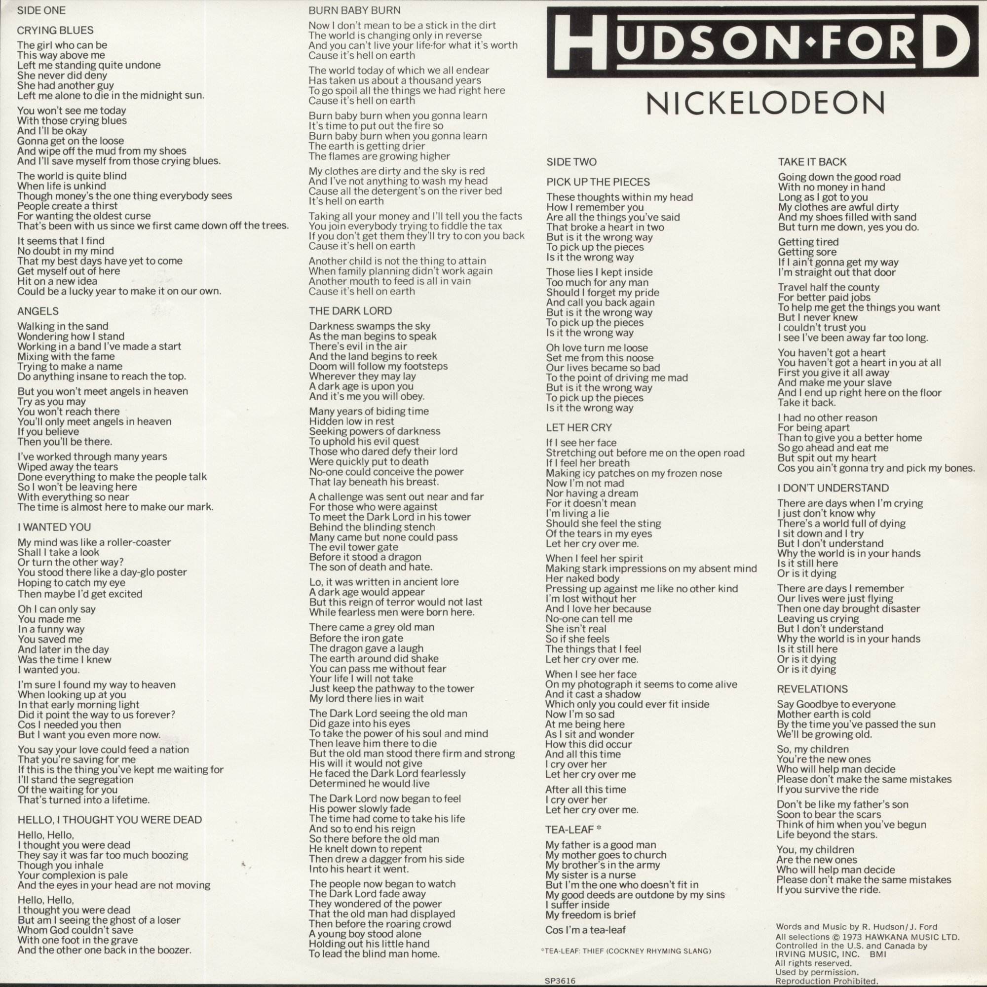 Vinyl album: AMLH 68208 (A&M, UK, 1973). Single sleeve. Issued with brown A&M label, may have been re-issued at later date with silver label. Two-side insert (28cm (11 in) by 28cm, slightly smaller than album size): one side has colour pic of Hud and John, the other has the album lyrics.